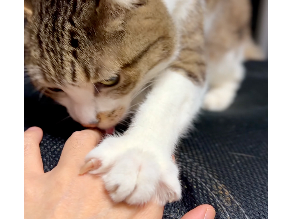 お部屋の椅子の上でまったり過ごす猫さん。 差し出された飼い主さんの指をじーっと見つめ、 「あ、これ舐めていいやつ?」と 前足でガッチリホールド! そのまま愛情たっぷりに 指の毛繕い(?)を始めてくれました。 グルーミングしてくれるなんて嬉しい... -
