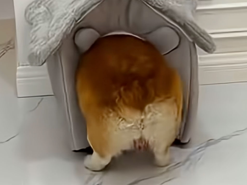 入り口でお尻がつっかえちゃう… 小さすぎるハウスに意地でも入りたいコーギーさん