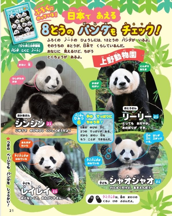 付録のノートに登場する12頭のパンダのうち、日本で会うことのできる8頭の特徴や見分け方を紹介する記事も掲載しており必見です。