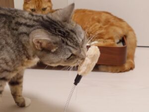 床から生えた不思議な物体? 100円おもちゃに夢中でパンチを繰り出す猫さんたち -